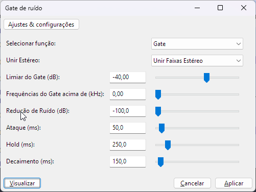 Primeiro, aplicamos um Noise Gate (geralmente configurado em -40dB, dependendo do ganho da gravação) para garantir um silêncio absoluto entre as frases. Em seguida, utilizamos a função Truncate Silence para remover pausas longas e condensar o áudio.