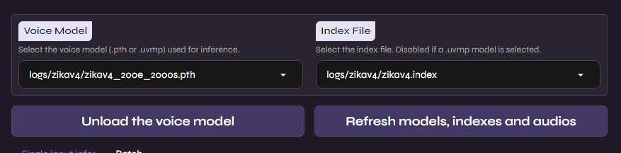 Na aba “Inference” do fork, vamos selecionar o modelo e arquivo de índice gerado na etapa de treinamento, após isso podemos seguir com algumas configurações