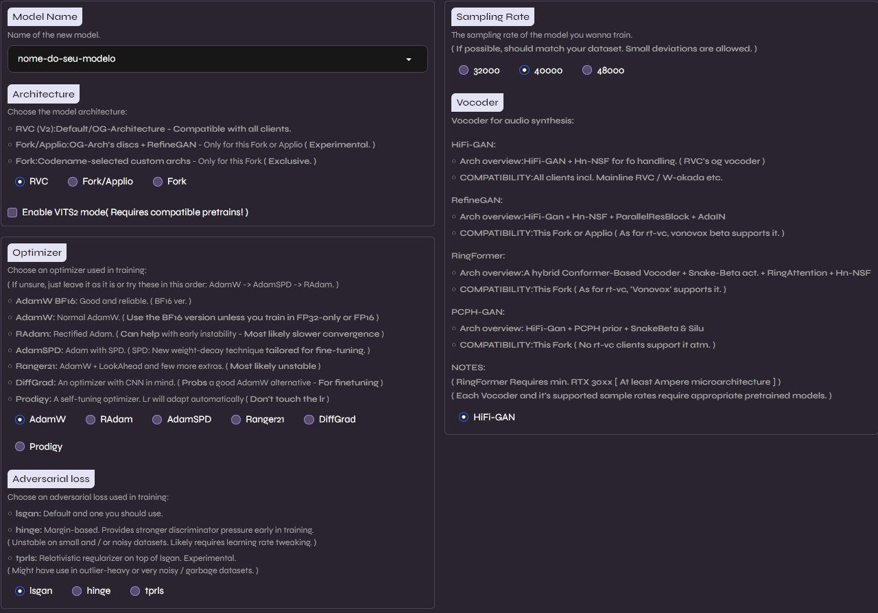 Vamos usar as configurações padrões da arquitetura RVC original, visto que essa é a mais testada e estável, certifique-se de configurar a taxa de amostragem na direita para que seja compatível com o seu dataset, variações pequenas de 2-4 KHz são permitidas, no nosso caso, com um dataset de 44.1Khz, vamos usar o modelo de 40Khz