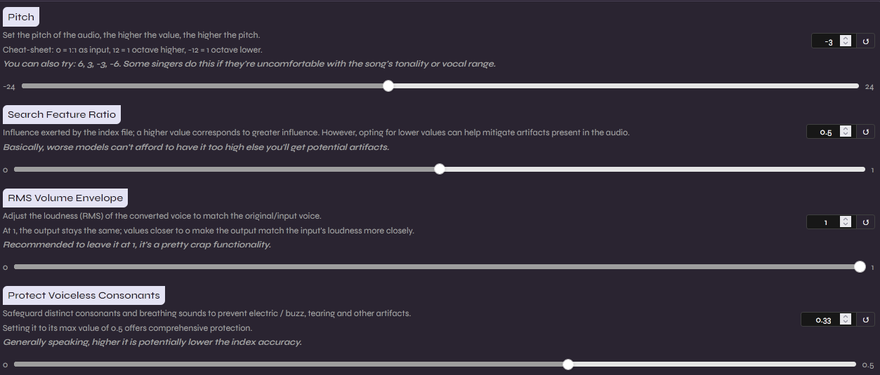 - Search Feature Ratio: Também conhecido como Index Rate, ele controla o quanto o modelo utiliza o arquivo de índice para recuperar o timbre original. Valores próximos a 0.75 costumam ser o sweet spot, recomendo você brincar com esse valor pois o resultado depende muito do sotaque da voz usada para o treinamento original