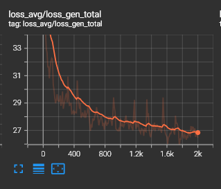 Ainda dentro da aba Scalars no Tensorboard, temos o gráfico de perda total (Total Loss) que representa a soma de todos os erros cometidos pelo modelo durante o processo de aprendizado, consolidando métricas como a perda do gerador, do discriminador e de reconstrução de feições. Diferente da similaridade Mel, este valor deve decair gradativamente ao longo do tempo. Uma curva descendente e suave é o sinal de um treinamento saudável e estável; se o valor estagnar muito cedo ou começar a subir (divergir), isso pode indicar que a taxa de aprendizado está muito alta ou que o dataset possui ruídos que estão confundindo o modelo.
