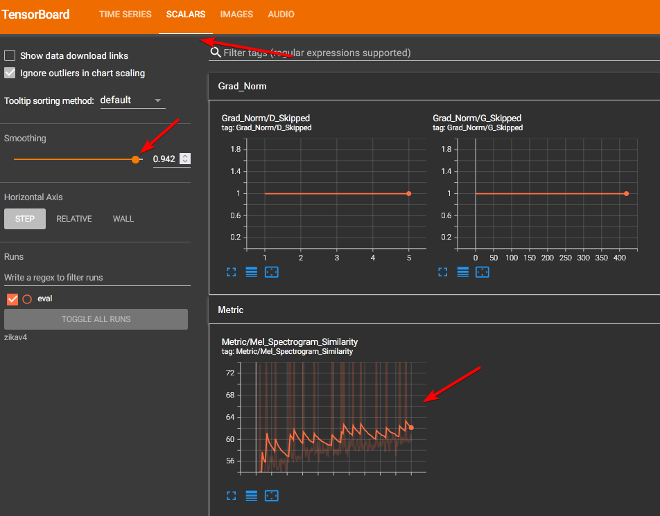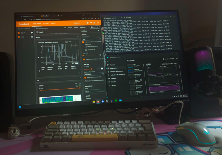 Aqui é configurado e realizado o treinamento. Para evitar overtraining, utilizaremos o Tensorboard para monitorar a saúde do modelo. Para um dataset de ~10 minutos, recomendo 200 epochs, salvando checkpoints a cada 50.