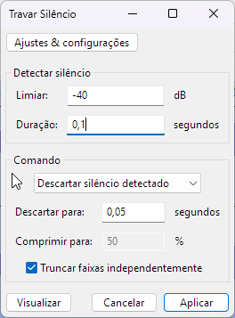 Primeiro, aplicamos um Noise Gate (geralmente configurado em -40dB, dependendo do ganho da gravação) para garantir um silêncio absoluto entre as frases. Em seguida, utilizamos a função Truncate Silence para remover pausas longas e condensar o áudio.