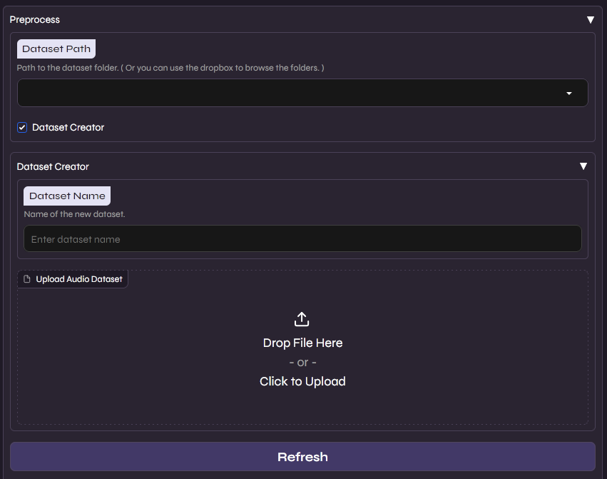Aqui você habilita a opção “Dataset Creator” e arraste o arquivo de áudio final do seu dataset, podendo então nomear ele e fazer o upload para a interface