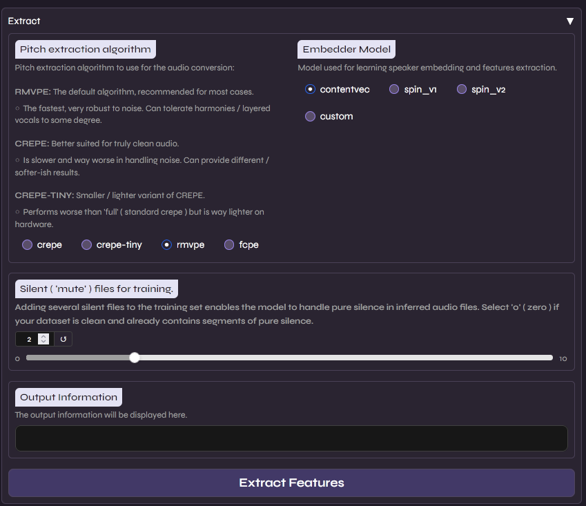 - RMVPE (Robust Minimum Variance Phase Estimation): É o algoritmo de extração de tom (F0) mais avançado atualmente. Ele é superior a métodos antigos (como Harvest ou Crepe) porque oferece uma precisão altíssima na detecção da frequência da voz, mesmo em áudios com pouco volume ou ruído residual, evitando que a voz “quebre” ou soe robótica em notas mais altas.