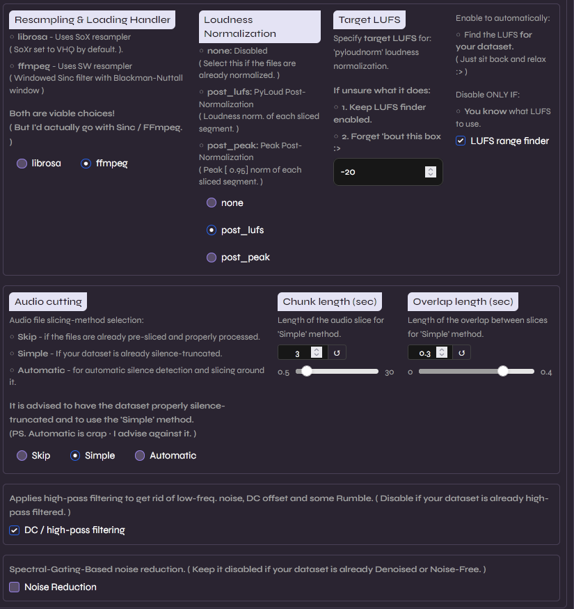 O uso do modo Simple em audio cutting é ideal aqui, pois como já tratamos os silêncios manualmente no Audacity, não precisamos que o algoritmo tente detectar pausas complexas. Por fim, o High-pass filtering é essencial para remover o “rumble” (frequências infra-sônicas) e o DC offset, que são ruídos imperceptíveis ao ouvido humano, mas que podem introduzir instabilidade no treinamento do modelo.