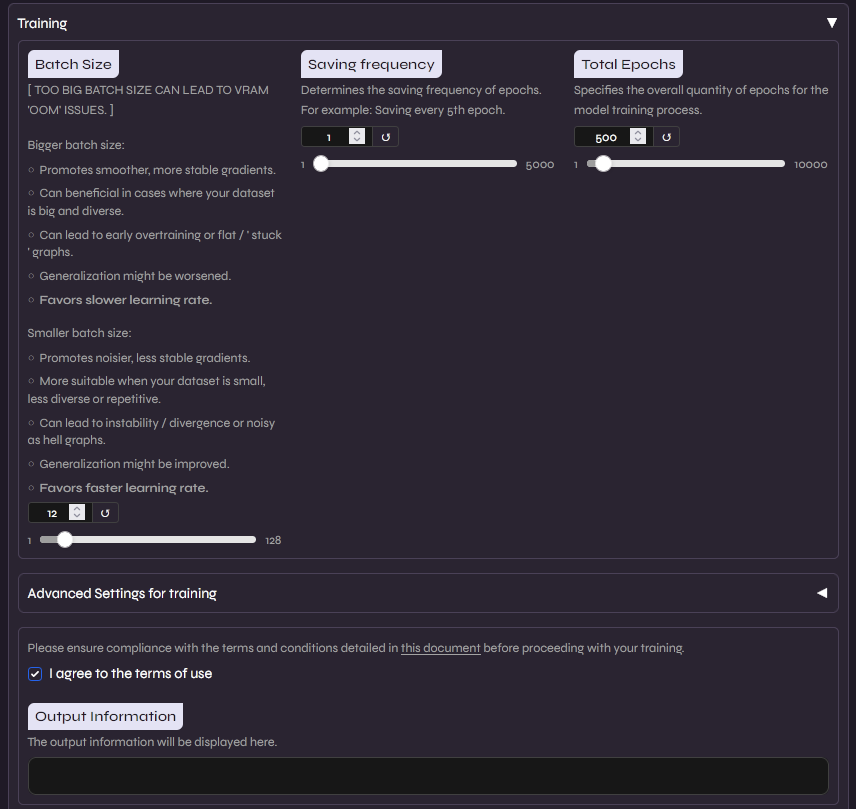 Aqui é configurado e realizado o treinamento. Para evitar overtraining, utilizaremos o Tensorboard para monitorar a saúde do modelo. Para um dataset de ~10 minutos, recomendo 200 epochs, salvando checkpoints a cada 50.
